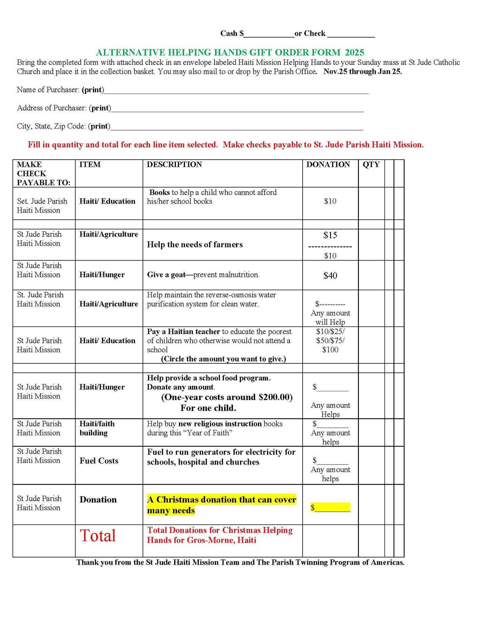 Through PTPA (Parish Twinning Program of Americas) we want to help our Twinned Parish, Paroisse Norte Dame De La Chandeleur, in Gros-Morne, Haiti at Christmas time. Here you have the opportunity to give a Helping Hand to Haitian families. During this holy Advent season please consider giving a gift of hope and love from the heart. Christmas is a time when we want to give our family and friends something that will touch their hearts. Something meaningful and special that will last a lifetime. Picking that perfect gift is often hard especially for someone who has everything. Give a gift yourself or delight a loved one with a gift to the poor in Gros-Morne, Haiti. During this time, when hope is in extremely short supply, your support is more crucial than ever! Over the past few years, we have been challenged by pandemic, violence and political unrest. Because of this we have been unable to visit our dear friends in our sister Parish in Gros-Moren or to send needed supplies by Sea Container. The needs are great and you can be a part of changing the lives of those who are struggling more than ever. All you need to do is take the Alternative Christmas Gift form, fill it out and attach cash or check written to St Jude Parish Haiti Mission. Put it in your PINK envelope or label another envelope Haiti Mission and place it in the collection baskets during mass. You may also mail it to the Parish office. Please look down the list of gifts on the form we have attached. There are gifts for any budget. Alternative Christmas Gift project will run Nov. 24 through Jan. 26.